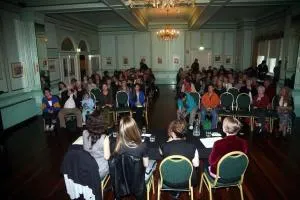 Love this photo of the event in the gorgeous Carrington Ballroom. I said it would be glamorous. Eau-de-nil walls, gold trim, chandelier, and so many people they had to bring in extra chairs.